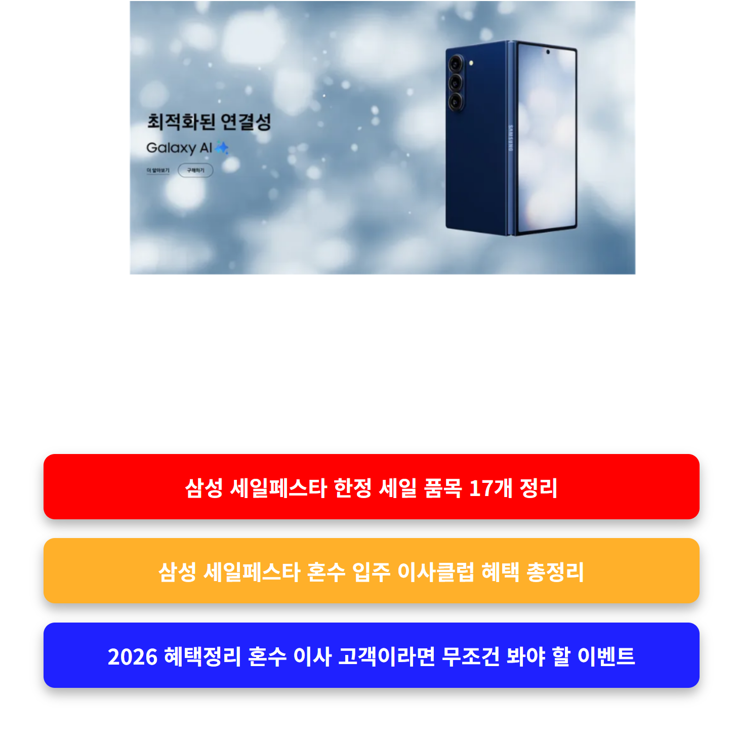 2026 삼성전자 세일페스타가 시작되면서 가장 주목받는 키워드는 바로 AI 패키지와 구독 트리플 혜택이다 단순히 가전을 사는 것이 아니라 ‘AI 제품을 조합해서 혜택을 극대화’할 수 있다는 점 이 글에서는 실제로 어떤 제품을 어떻게 조합하면 삼세페에서 혜택을 2배 3배로 받을 수 있는지 실제 시나리오 기반으로 완벽하게 정리해본다