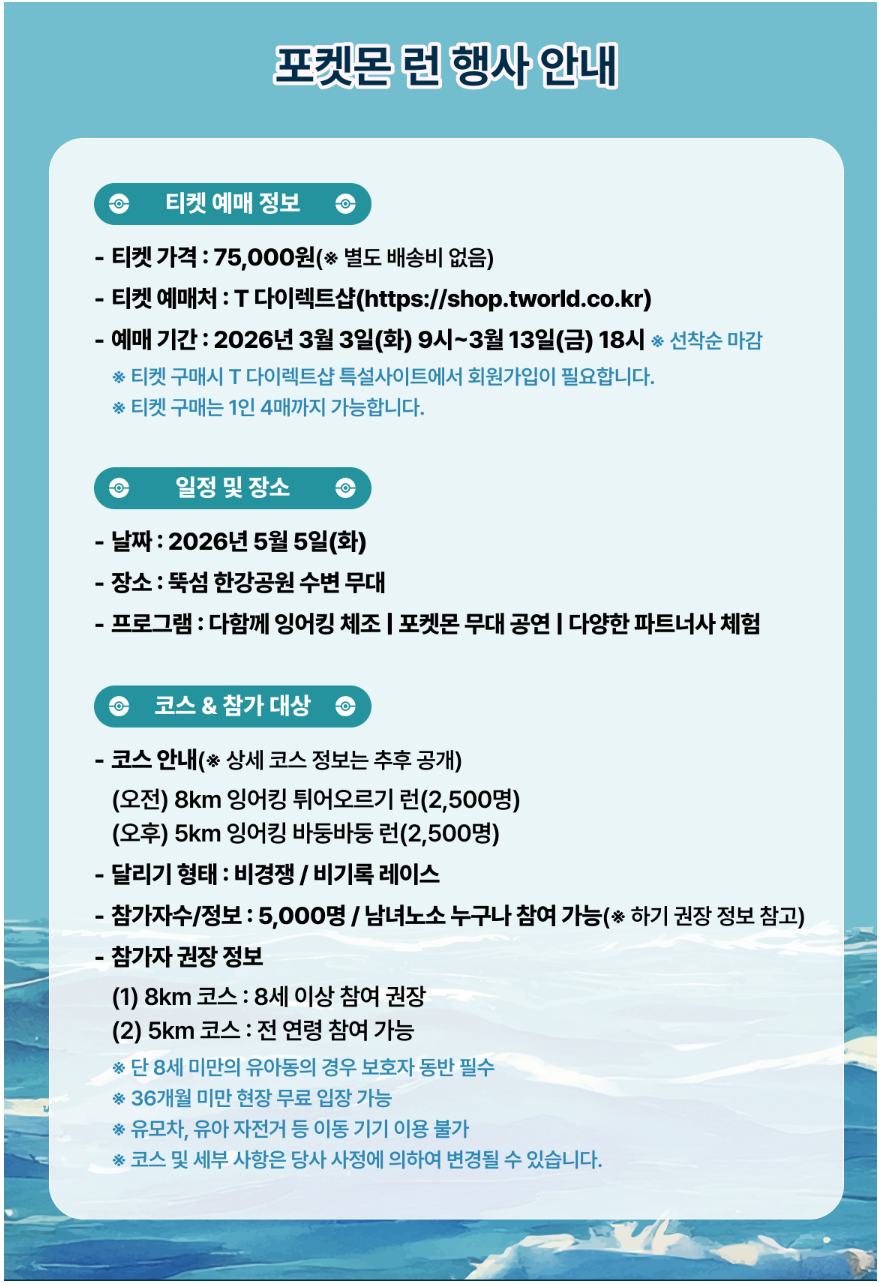 2026 포켓몬런 서울 잉어킹 마라톤 예매 시작! SKT T 다이렉트샵 티켓 75,000원 총정리